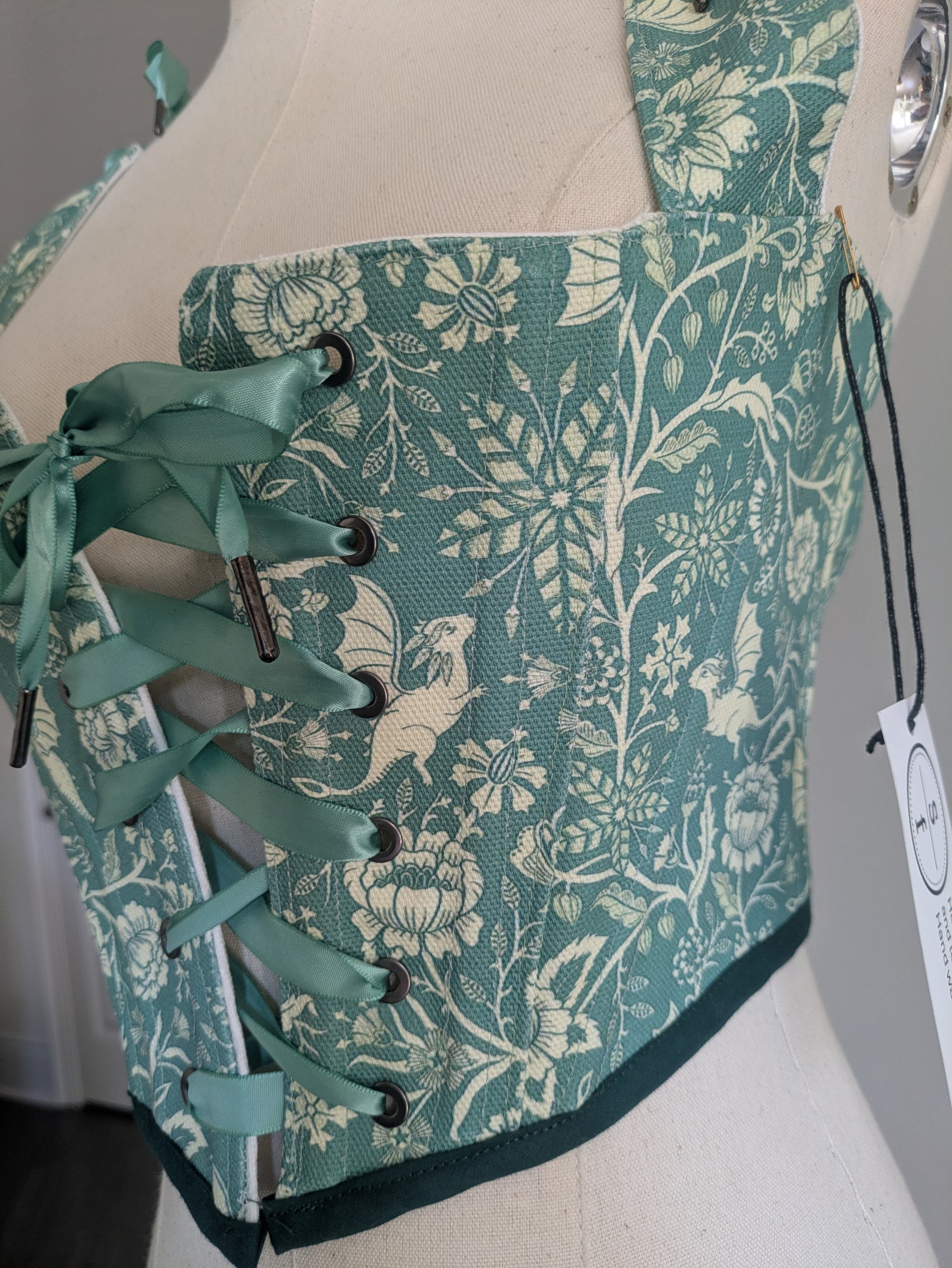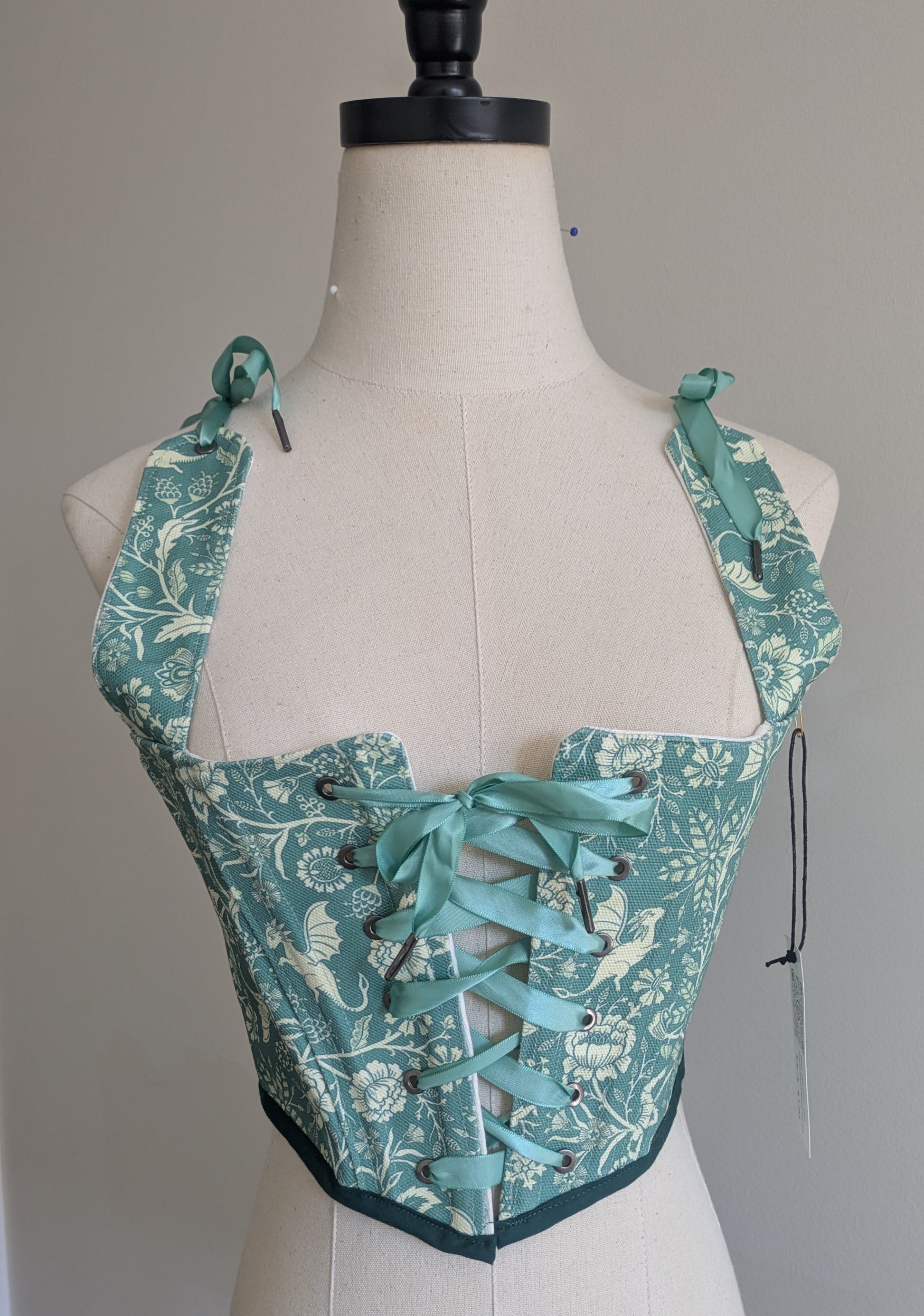Materials: Outer fabric varies from polyester to cotton. Lining is100% cotton canvas. Brass grommets. Polyester satin ribbon ties with brass aglets. Polyester boning included for structure. Grommet and aglet color may vary.